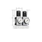 Advantages: •by combining several regulators in a block, one compressed air supply can supply several compressed air circuits with independently controllable pressures. The compressed air outlet (G 3/8") is located opposite the pressure gauge.